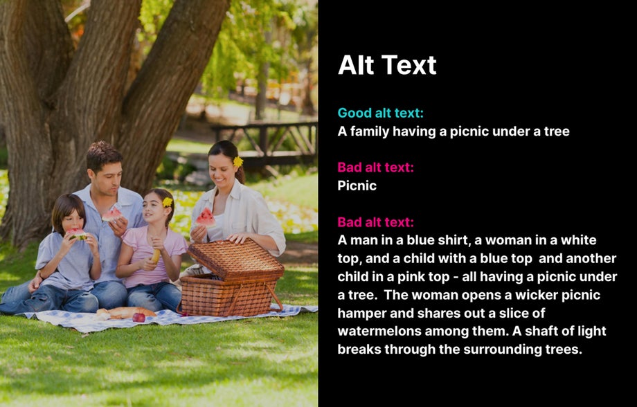 - Provide descriptive alt text for all images. Alt text allows users who rely on screen readers to understand the purpose or context of an image, even if they can’t see it.